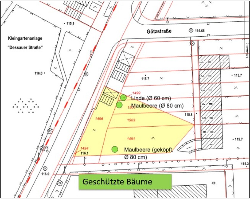 Die auf dem Grundstück vorhandenen gemäß Baumschutzsatzung der Stadt Halle (Saale) geschützten Bäume sind im Rahmen des Bauantrags auf eine Einordnung in das Bauvorhaben zu prüfen. Die Lage der geschützten Bäume ist der beigefügten Karte zu entnehmen.