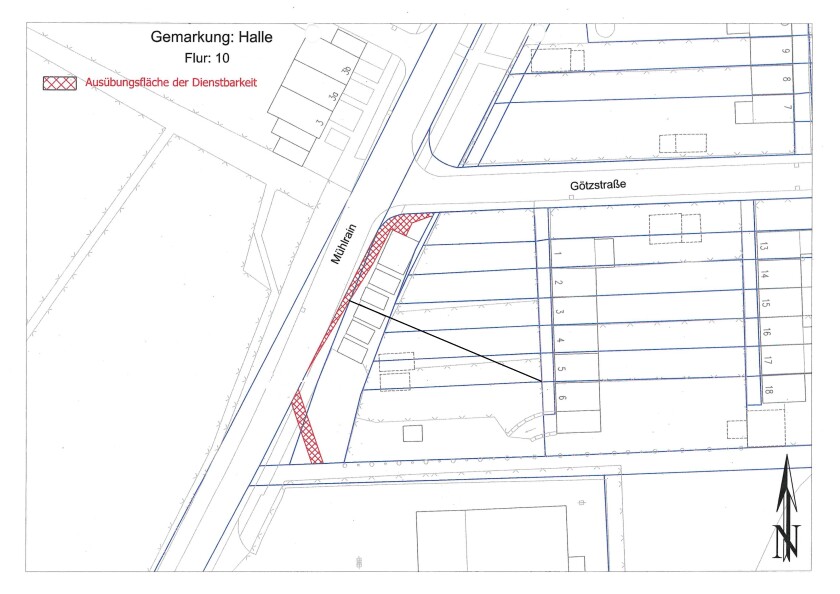 Es wird auf Folgendes hingewiesen: An der östlichen Grundstücksgrenze befindet sich die Zuwegung zu den einzelnen Grundstücken der Reihenhausbebauung (Götzstraße 1 - 6). In dieser Zuwegung liegen die Versorgungsleitungen sowie Abwasser. Es handelt sich hierbei nicht um öffentliche Leitungen, sondern um private Anschlussleitungen der anliegenden Eigentümer der Götzstraße 1 - 6. Der Schutzstreifen der Abwasserleitung fällt auf das Verkaufsgrundstück und ist nicht dinglich im Grundbuch gesichert. Erforderliche Instandsetzungsmaßnahmen am Leitungsbestand sind zu dulden.