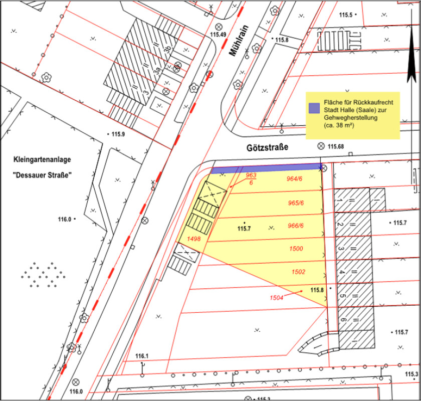 Perspektivisch ist vorgesehen, in der Götzstraße einen Gehweg herzustellen. Dafür wird zugunsten der Stadt Halle (Saale) im Kaufvertrag ein Wiederkaufsrecht für einen 3 m breiten Streifen entlang der nördlichen Grundstücksgrenze vereinbart. Die betroffene Grundstücksteilfläche (ca. 38 m²) ist zu gegebener Zeit frei von Aufbauten und Aufwuchs bzw. Bepflanzungen jeglicher Art an die Stadt zurück zu verkaufen. Der Anspruch auf Wiederkauf wird durch eine Vormerkung im Grundbuch zu Gunsten der Stadt Halle (Saale) gesichert.